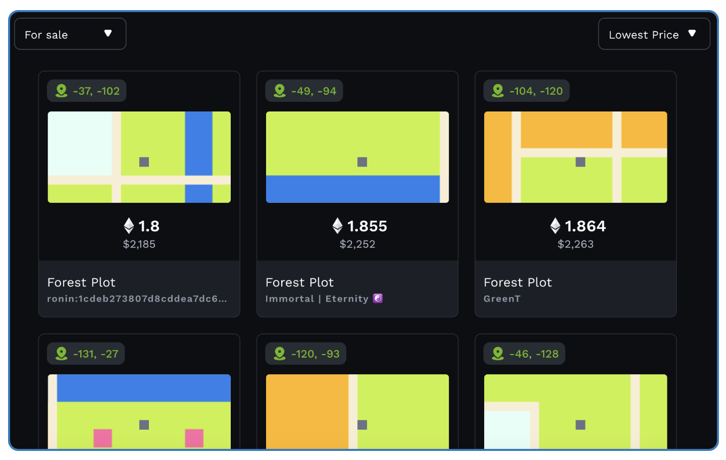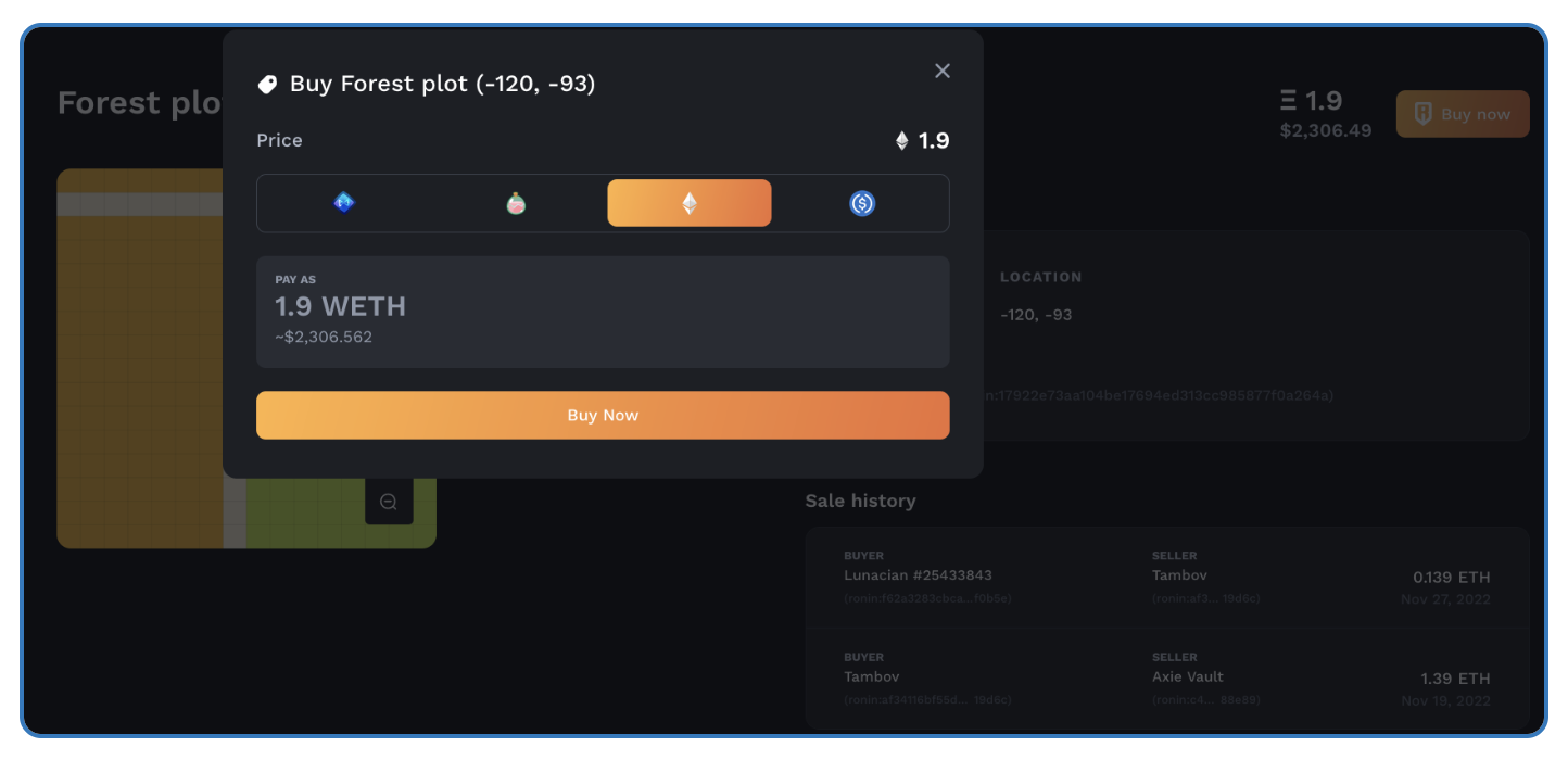 Clicking a land plot will allow you to view the exact map location, as well as the selling price, sale history and the option to purchase the land plot.