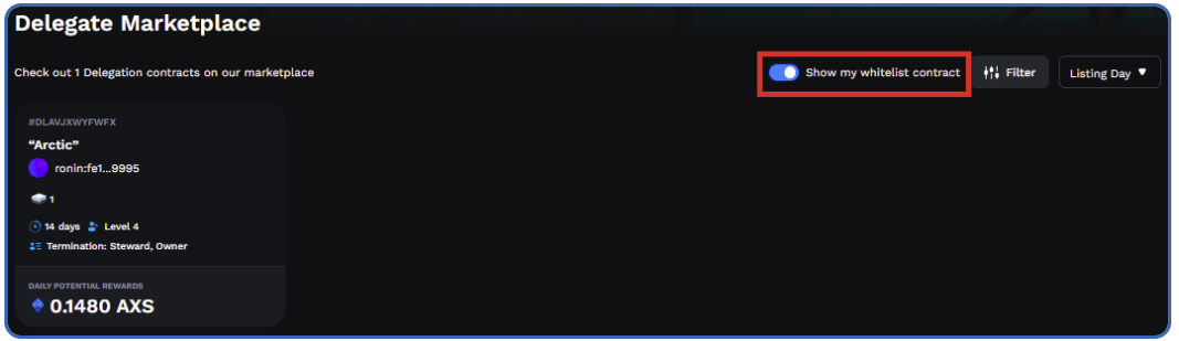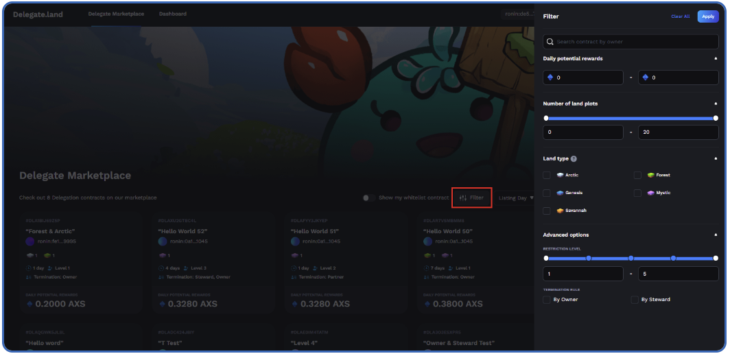 Navigating the marketplace is facilitated through the use of the Filter button, simplifying the process of sorting through all delegation listings. Sorting options include daily potential rewards, the number of land plots (in a single listing, land type), restriction levels, and termination rules.