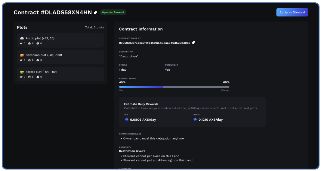 Step 4. Review Contract Details: Carefully review the contract details provided by the owner. Ensure that the terms and expectations outlined in the contract align well with your role as a steward. In addition to considering land types and listing duration, it is important to examine Restriction Levels, Reward Percentage Splits, and Termination Rules. Explanations are provided below.
