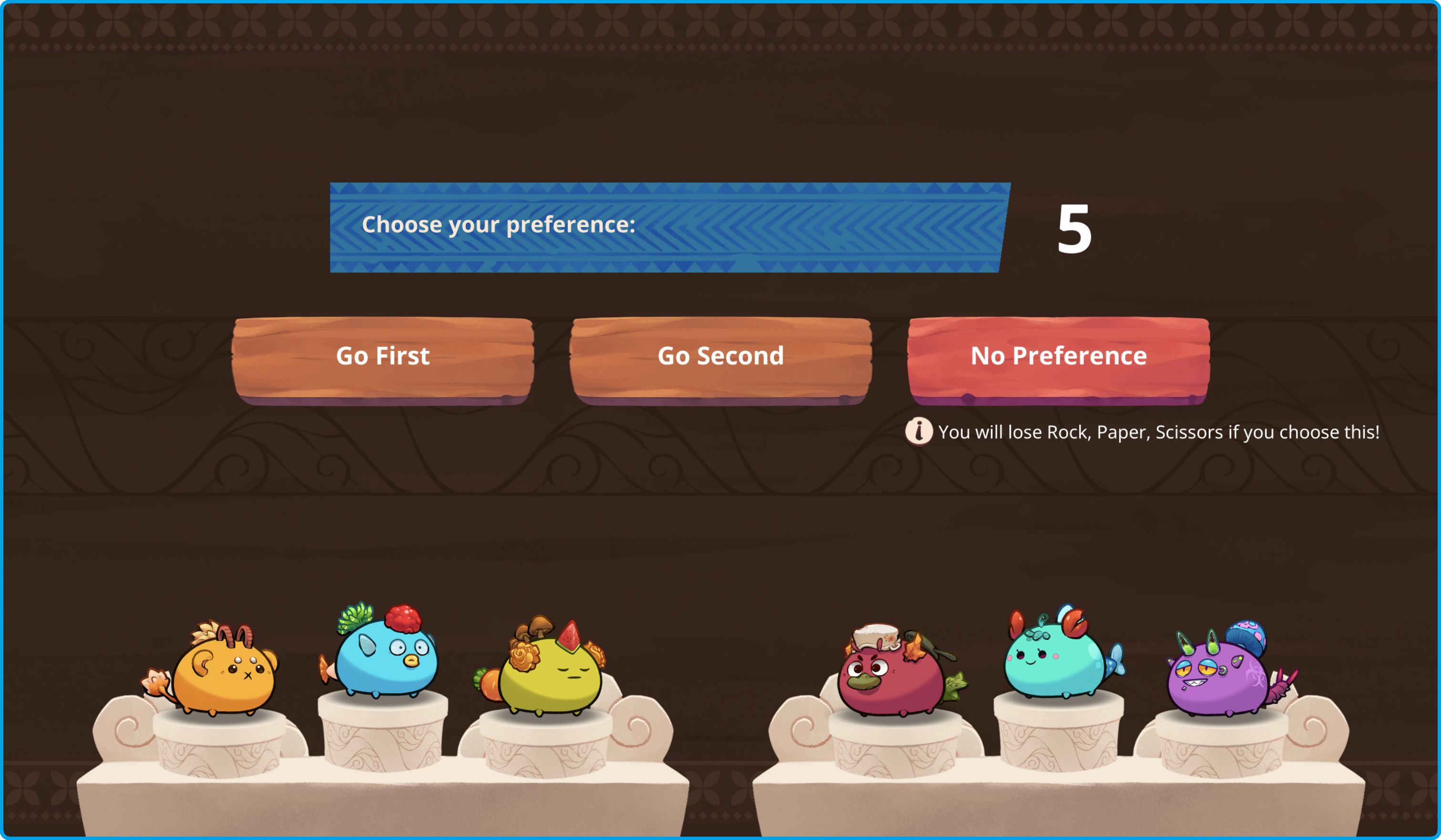 If both players choose the same turn preference (Go First or Go Second), a game of Rock-Paper-Scissors will be played to determine who will get their desired turn preference. The winner of the Rock-Paper-Scissors game will receive their intended turn preference, while if the game ends in a draw three times, turn preference will be assigned randomly for both players.