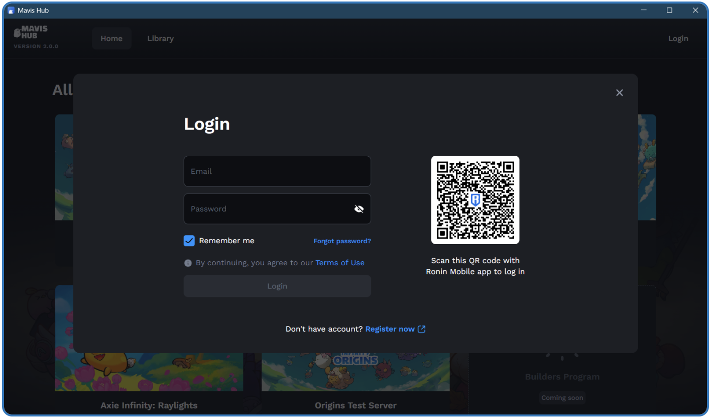 Revisit the Mavis Hub launcher and sign in using the email address and password used to create your Axie Infinity account.