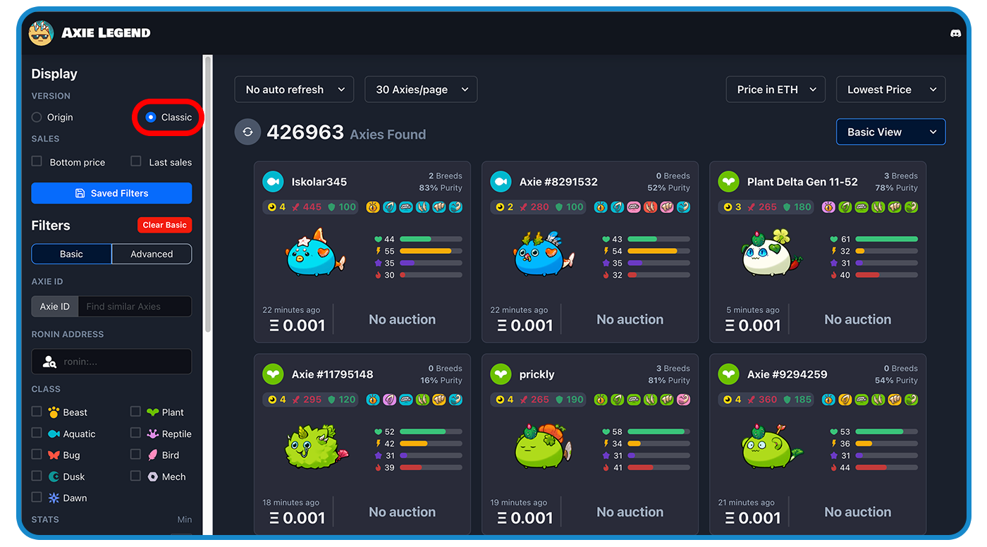 You can use the App.Axie Marketplace to look for axies to use in Axie Classic. You can check an axie's cards and stats by switching the game to "Axie Infinity: Classic" on the Utilities section of an axie's details page.