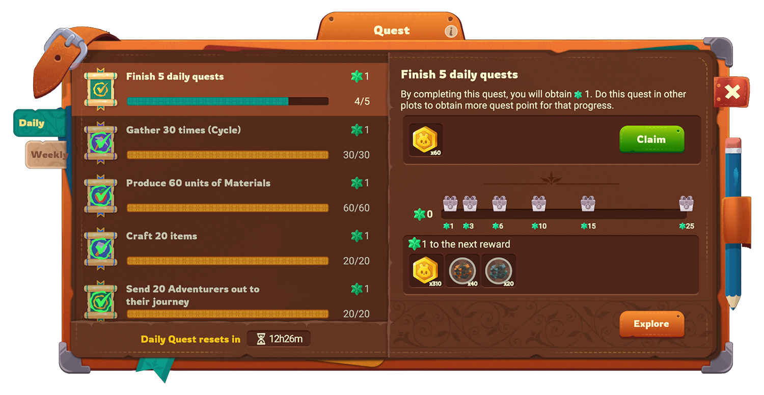 The Daily Quests are quests that can be done once per plot per day, and is reset every day at 00:00 UTC on the server. A countdown for the reset is available in the Daily Quest menu. It is important to claim the rewards before ending the day's play.