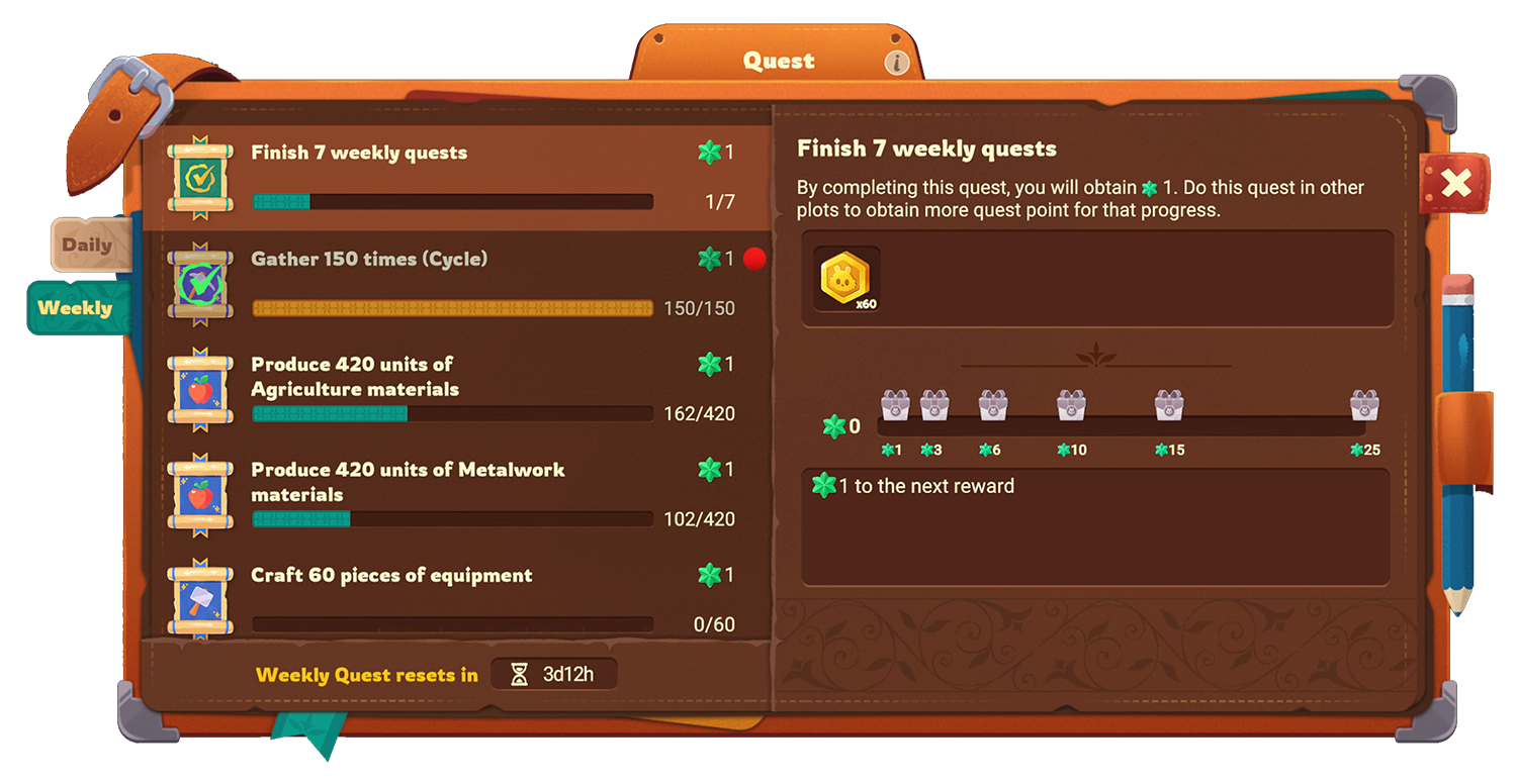 The Weekly Quests are quests that can be done once per plot per week, and is refreshed only once per week. The countdown for the reset can be viewed in the Weekly Quest menu.