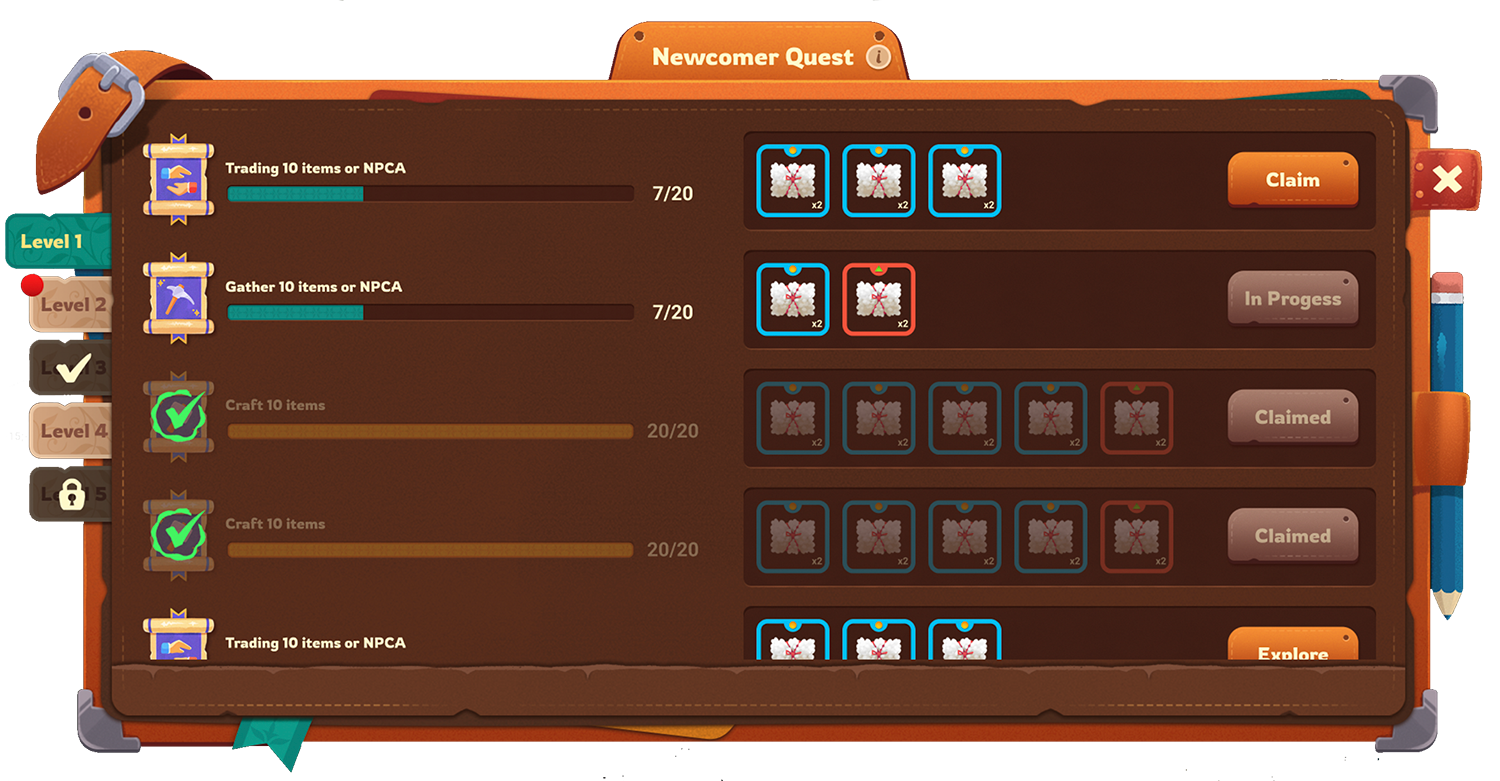 The Newcomer Quest is a unique quest that is only given to players once. A particular number of quests will be provided to the player per level. To unlock a new level, the Altar of Atia must be upgraded to a higher level. Once a new level is unlocked, the player will receive a new set of quests with new rewards.